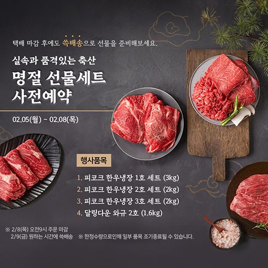SSG닷컴, 설 전날 받을 수 있는 한우세트 예약 판매…배송일정 걱정 없이 받아보세요SSG닷컴은 5일부터 오는 8일 오전 9시까지 설 전날인 9일 받아볼 수 있는 축산 선물세트 4종을 예약 판매한다고 밝혔다.