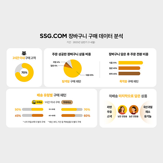 SSG닷컴, 주문으로 이어진 장바구니 패턴 분석해보니… 고객 70%가 2시간 내 구매SSG닷컴은 올 상반기 주문으로 이어진 장바구니 패턴 분석 결과를 26일 공개했다. 대표적으로 상품을 장바구니에 담은 후 2시간 이내에 구매한 고객이 70% 인 것으로 나타났다. 이를 고려해 쓱닷컴은 2시간 내 구매를 이끌어 내고자 상품별, 배송유형별, 연령별 요소를 고려해 판매 전략을 세우고 이를 플랫폼에 적용하고 있다.