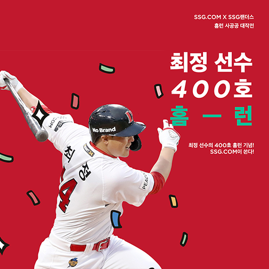 SSG닷컴, ‘최정 400호 홈런’ 기념 ‘사공공(400) 대작전’ 프로모션 진행‘사공공 대작전’은 현재 진행 중인 SSG닷컴의 광고 캠페인 ‘공공대작전’과 최정 선수의 ‘400호’ 홈런을 합친 것이다. SSG닷컴은 야구단과 연계한 적극적인 마케팅 행사를 통해 고객들에게 또 한 번 혜택을 제공한다는 방침이다. SSG닷컴은 행사 기간 동안 선착순 10만명에게 신세계몰, 이마트몰, 신세계백화점몰 등에서 사용 가능한 10% 할인 쿠폰을 제공한다. 최정 선수 400호 홈런을 축하하는 행사 취지에 맞게 다양한 댓글 이벤트도 진행한다.