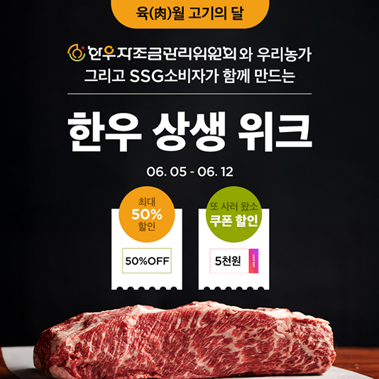 SSG닷컴, 한우자조금과 ‘한우 상생 위크’ 진행SSG닷컴이 오는 12일까지 일주일간 한우자조금관리위원회와 협력해 ‘한우 상생 위크’를 열고, 부위별·등급별 한우 13종을 반값 할인한다고 5일 밝혔다.