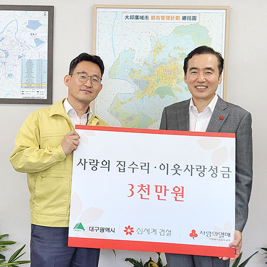 신세계건설, 대구시 주거 취약계층에 사랑의 집수리 지원신세계건설이 대구시가 시행하고 있는 주거 취약계층의 ‘사랑의 집수리’ 사업에 참여한다고 밝혔다. 신세계건설이 대구시가 시행하고 있는 주거 취약계층의 ‘사랑의 집수리’ 사업에 참여한다고 밝혔다.
