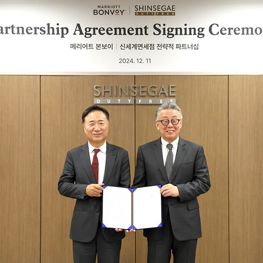 신세계면세점, 2억명 글로벌 고객 공략… 국내 면세점 최초 메리어트 본보이와 전략적 파트너십 체결신세계면세점이 국내 면세업계 최초로 글로벌 호텔 체인 메리어트 인터내셔널과 전략적 업무 협약을 맺고 글로벌 면세 시장에서의 입지 강화에 나섰다.