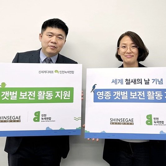 신세계면세점, ‘세계 철새의 날’ 맞아 영종도 갯벌 보전 후원금 기부신세계면세점은 ‘세계 철새의 날’(5월 10일)을 맞아 인천녹색연합에 영종도 갯벌 보전 활동을 위한 후원금 1,000만 원을 전달했다.