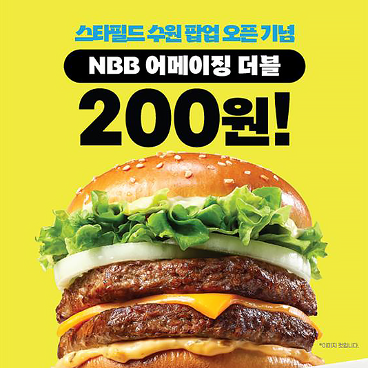세상에 없던 가성비 버거가 스타필드 수원에! 노브랜드 버거 팝업 매장 오픈런 이어져25일 스타필드 수원 노브랜드 버거 팝업 매장에서 모델들이 ‘NBB 어메이징 더블’을 소개하고 있다.