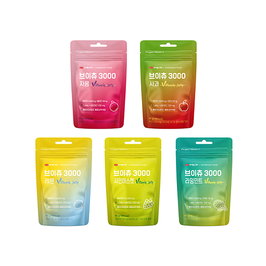 신세계푸드가 한미헬스케어와 협업을 통해 비타민 젤리 ‘브이츄 3000(V-chew 3000)’ 5종을 출시한다. ‘브이츄 3000’은 레몬, 자몽, 사과, 샤인머스켓, 라임민트 등 5가지의 천연 과즙이 들어간 구미젤리로 씹으면 젤리 안의 과즙 잼이 터지면서 새콤달콤한 맛을 즐길 수 있는 것이 특징이다.
