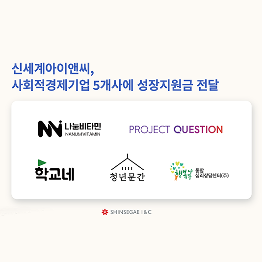 신세계아이앤씨, 사회적경제기업 5개사에 성장지원금 전달신세계아이앤씨(신세계I&C)가 사회적경제기업을 지원하는 ‘미니콘테스트’ 지원 기업을 발표하고, 최종 5개 기업에 총 6,000만원의 성장지원금을 전달했다.