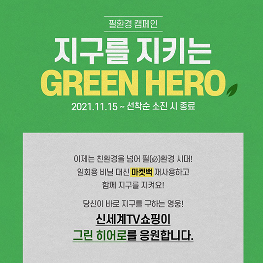 ‘그린 히어로(GREEN HERO) 프로젝트’는 작년 국내 최초로 도입한 단일소재 생분해성 포장재 사용에 이은 후속 활동으로, 일상에서 일회용 포장 비닐 대신 재사용할 수 있는 마켓백의 사용을 권장하는 환경 캠페인이다. 신세계TV쇼핑은 이와 관련해 우선 15일부터 판매가 5천원 이상의 상품을 주문하고, 홈페이지에서 응원 댓글에 참여한 고객에게 ‘그린 히어로 마켓백’ 3만 개를 한정수량 증정하는 행사를 실시한다.