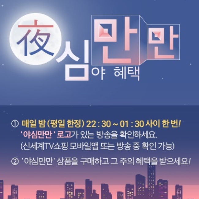 평일 오후 10시 30분부터 새벽 1시 30분까지 진행되는 방송 중 ‘야심만만’ 로고가 있는 방송의 상품을 구매하는 모든 신세계TV쇼핑 회원 고객을 대상으로 적립금, 할인 등의 혜택을 제공한다.2019.07.30 -