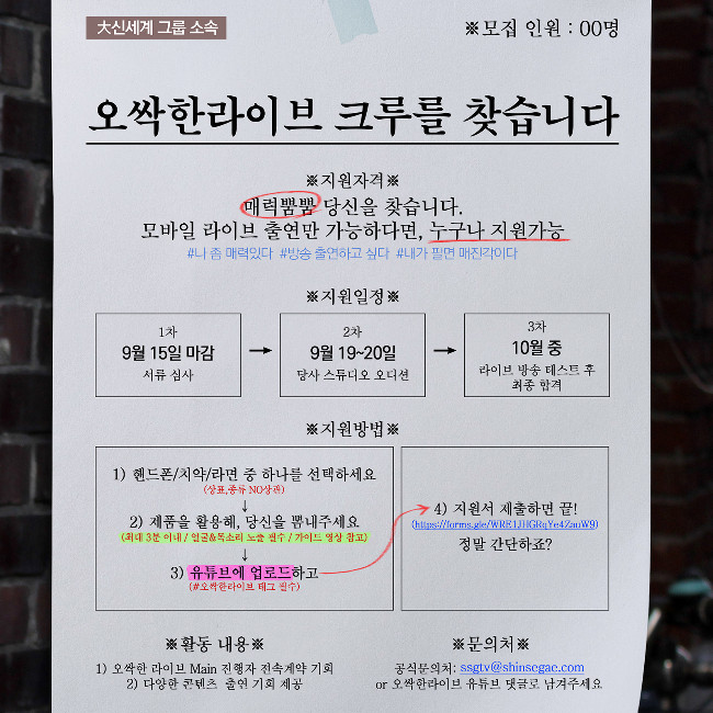 신세계TV쇼핑, 모바일 생방송 진행할 ‘오싹한라이브 크루’ 공개 모집신세계TV쇼핑이 오는 14일(수)부터 9월 6일(금)까지 모바일 생방송 ‘오싹한 라이브’를 진행할 ‘크리에이터 크루’를 공개 모집한다.
