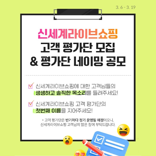 신세계라이브쇼핑, 업계 최대 규모 1천명 고객 평가단 모집…고객 목소리 더 많이 듣는다.신세계라이브쇼핑은 오는 3월 19일까지 23년 고객 평가단을 모집한다고 밝혔다.