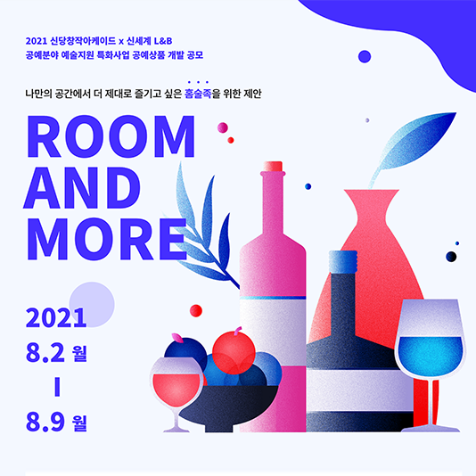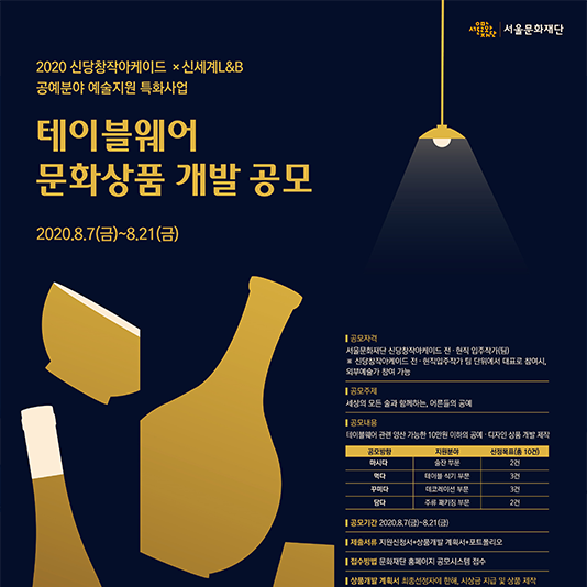 신세계L&B, 서울문화재단과 함께 공예작가 지원 공모전 개최신세계그룹의 주류 유통 전문기업인 신세계L&B와 서울문화재단이 코로나 19 장기화로 어려움을 겪는 공예 작가들을 위해 테이블 웨어 공모전 ‘Room and More’를 개최한다. 공모전의 주제는 집에서 편안하게 술을 즐기는 홈술족들을 위한 ‘테이블 웨어’로 지원 분야는 술잔, 식기, 데코레이션, 패키징 등 상품화가 가능한 품목들이다.