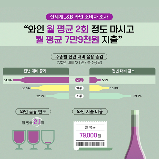 신세계L&B, 와인 소비자 대상 와인 음용률 등 조사 발표와인 음용 경험이 있는 2050세대 성인남녀 절반 정도는 지난해 와인 음용이 전년대비 증가했다고 답했다. 주류유통전문기업 신세계L&B(이하, 신세계엘앤비)가 마케팅 여론조사 전문기업 한국리서치를 통해 3개월 이내 와인 음용 경험이 있는 5대 광역시 거주 만 20세~54세 성인남녀 817명을 대상으로 진행한 와인에 대한 설문조사 결과를 발표하고, 이같이 밝혔다.