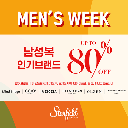 신세계프라퍼티는 스타필드 코엑스몰 지하 2층 라이브 플라자에서 오는 27일(일)까지 10일간, 인기 남성복 브랜드 제품을 최대 80% 할인 판매하는 ‘멘즈위크(Men’s Week)’를 진행한다고 18일(금) 밝혔다.
