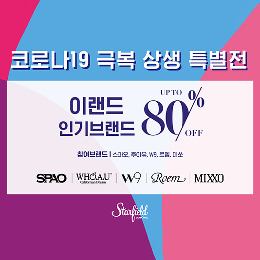 스타필드 코엑스몰, ‘코로나19 극복 상생 특별전 2탄’ 진행…패션업계와 상생 이어간다스타필드 코엑스몰이 22일(월)까지 이랜드 월드와 함께 ‘코로나19 극복 상생 특별전 2탄’을 연다. 스타필드 코엑스몰은 ‘코로나19 극복 상생 특별전 1탄’을 성공적으로 마무리하고, 참여 브랜드와 소비자의 호응에 힘입어 이번 특별전을 연속 진행한다.