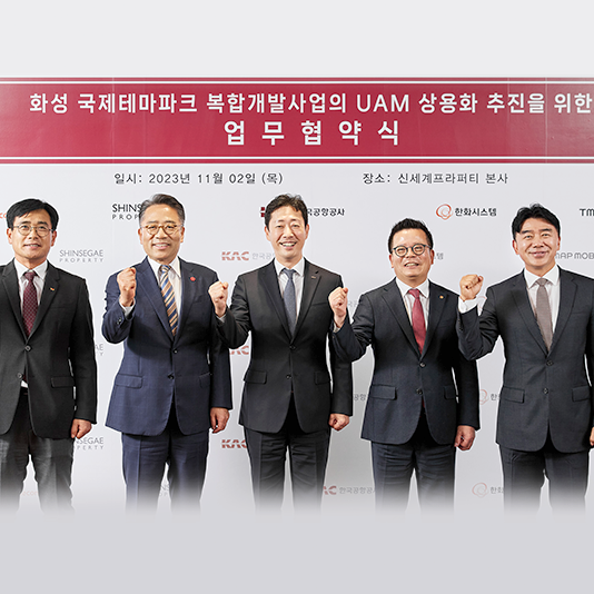 신세계프라퍼티, 화성국제테마파크에 하늘길 열린다새로운 혁신 도시 ‘화성국제테마파크’에 새로운 하늘 길이 열린다. 종합 부동산 디벨로퍼 신세계프라퍼티가 한국공항공사·한화시스템·SK텔레콤·티맵모빌리티로 구성된 ‘K-UAM 드림팀’ 컨소시엄과 ‘화성국제테마파크 복합개발사업의 도심항공교통(이하 UAM) 상용화 추진을 위한 업무협약(MOU)’을 체결했다.