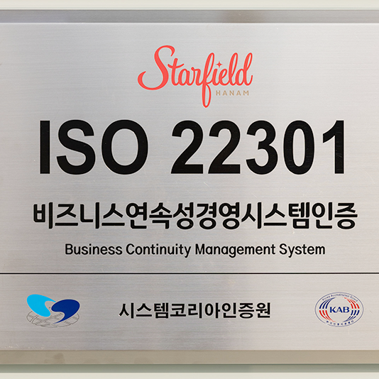 스타필드 하남, 업무연속성경영시스템 ISO 22301 인증스타필드 하남이 국내 대형쇼핑몰 중 최초로 국제표준화기구(ISO)의 사업연속성경영시스템(ISO 22301: 2019) 인증을 획득, 고객과 직원 모든 방문객이 언제나 안심하고 이용할 수 있는 안전한 환경을 제공한다.