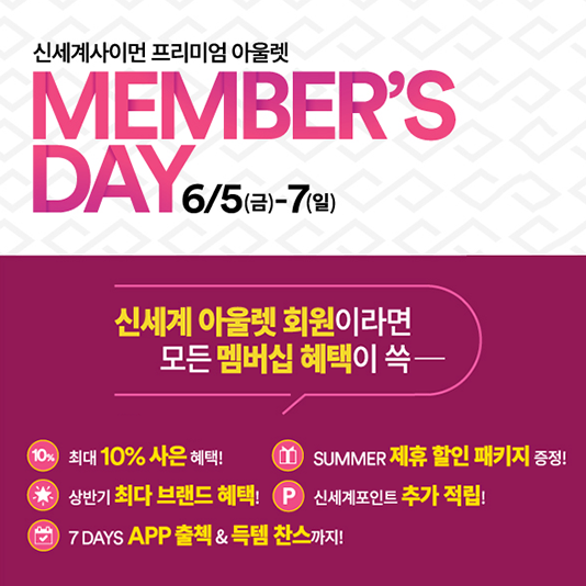신세계 프리미엄 아울렛 회원들을 위한 ‘신세계사이먼 멤버스 데이’ 개최신세계사이먼 프리미엄 아울렛이 고객의 성원에 보답하고 협력업체의 어려운 재고 상황을 해소하고자 5일(금)부터 3일 동안 여주, 파주, 시흥, 부산 프리미엄 아울렛 전 점에서 ‘신세계사이먼 멤버스 데이’를 개최한다.