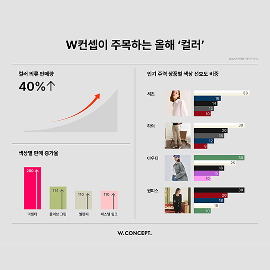 W컨셉, “작년 봄에는 몰랐잖아 알록달록한 세상”…W컨셉이 주목하는 올해 컬러는패션 플랫폼 W컨셉이 지난 한 해 품목별 인기 색상을 분석하고, 이번 시즌 유행할 것으로 예상되는 트렌드 컬러를 공개한다. 엔데믹 이후 첫 봄을 맞아 SS 시즌 패피(패션피플)들의 아이템 고민이 커질 것을 고려해 의류 아이템별 인기 컬러를 제안한다는 계획이다.