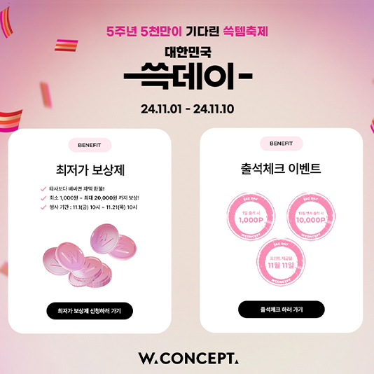 W컨셉, 쓱데이 맞아 ‘최저가 보상제’ 실시패션 플랫폼 W컨셉이 최저가 보상제 실시하는 등 역대 최대 혜택을 앞세워 대한민국 대표 쇼핑 축제 ‘쓱데이’에 힘을 보탠다.