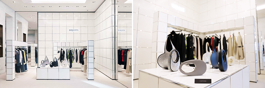 이번 팝업 매장은 코페르니의 브랜드 특성을 살려 미래지향적인 콘셉트로 꾸며져 마치 우주를 연상시킨다. 거기에 깔끔한 선이 특징인 USM의 미니멀리즘 가구는 코페르니의 디자인과 어우러져 옷과 가방을 더욱 돋보이게 해준다.