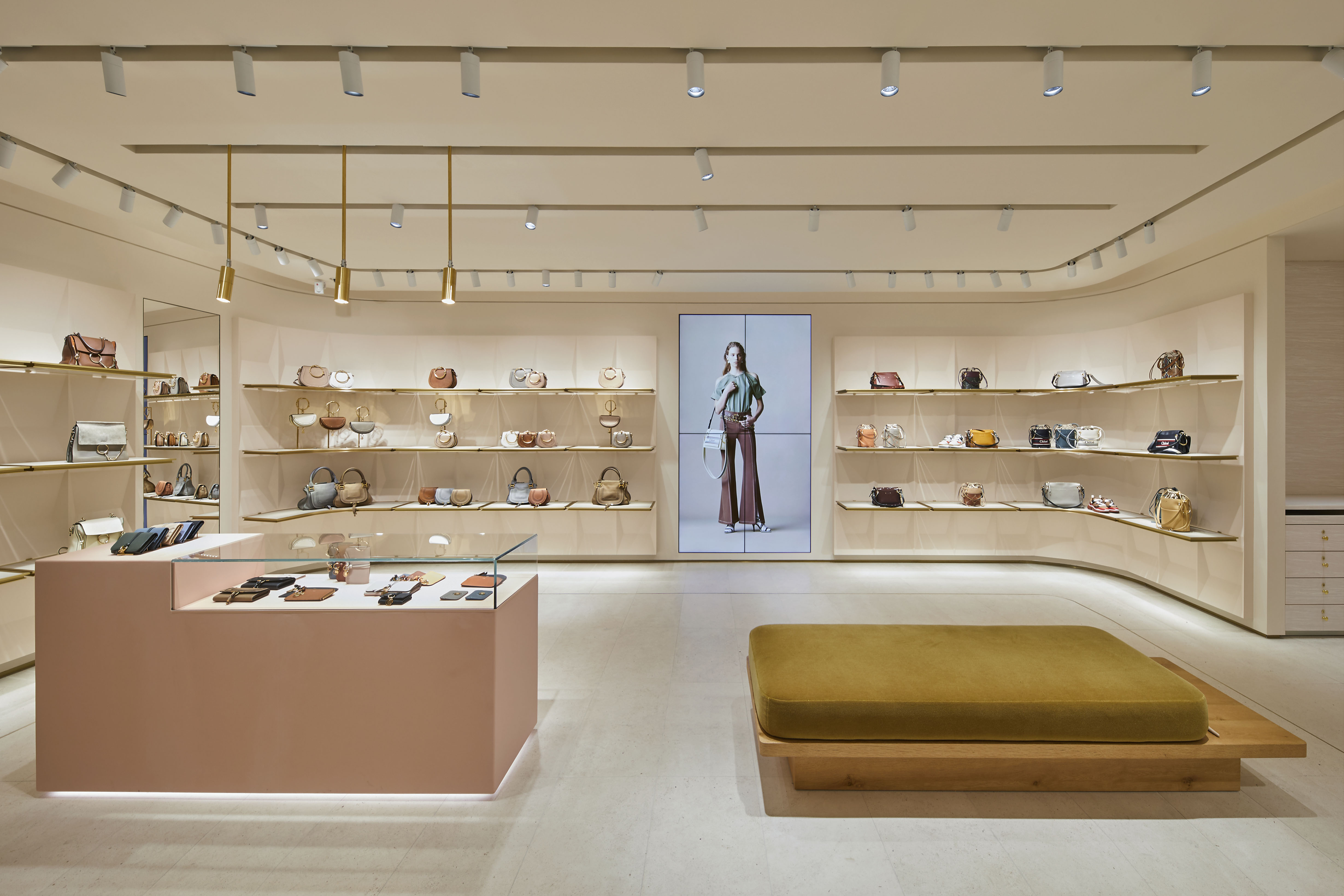베이지 톤의 대리석 벽면을 따라 끌로에 C, 테스, 마르씨 등 대표적인 핸드백 컬렉션을 한 눈에 볼 수 있게 배치했다.