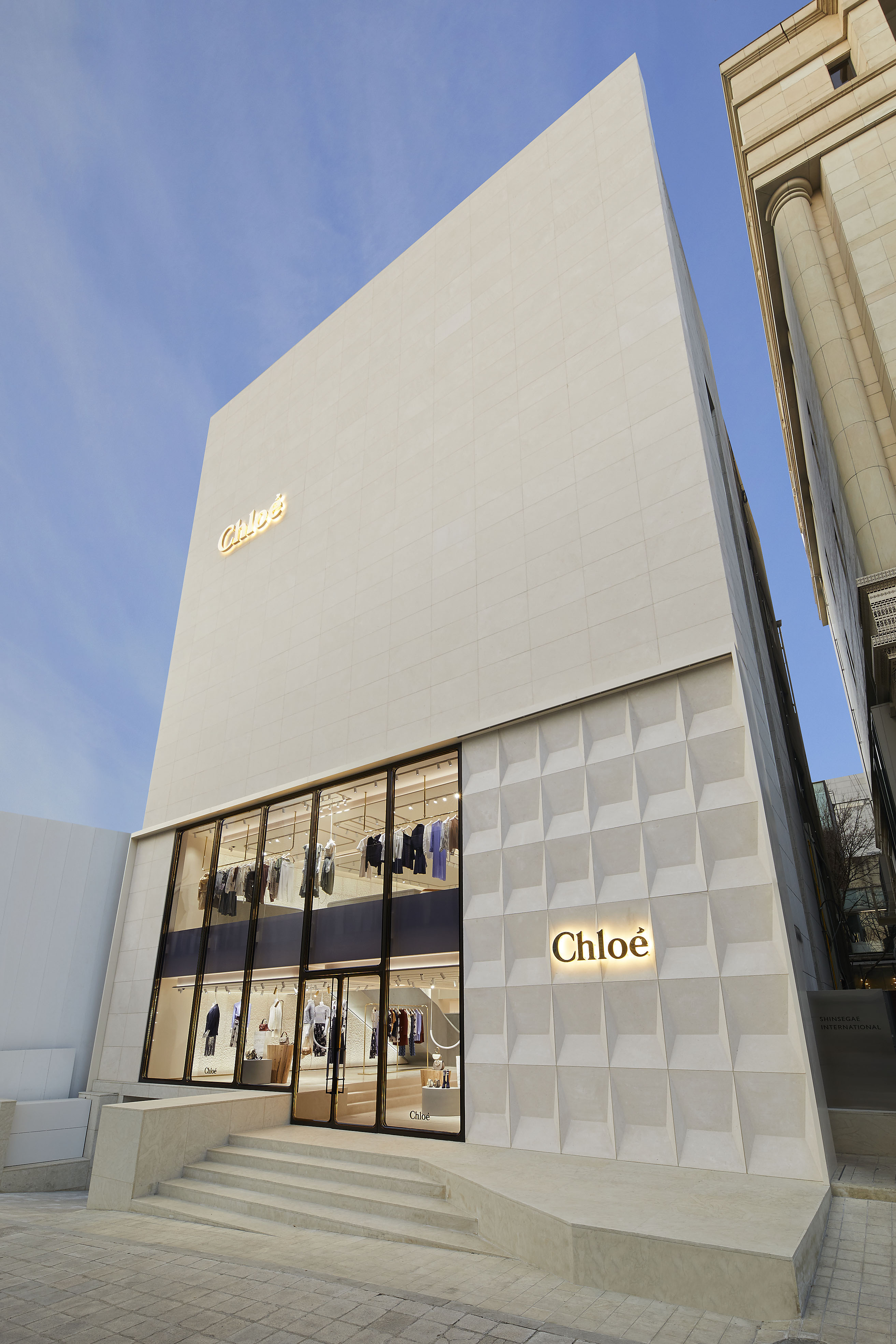 건물의 파사드(facade, 정면, 외관)는 베이지 톤의 대리석과 황동으로 제작된 끌로에 로고로 장식됐다.