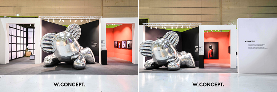 라운지 중앙부에는 조각을 전공한 아티스트 ‘임지빈’ 작가와 협업한 초대형 베어 벌룬 전시가, 양쪽 공간에서는 포토그래퍼 ‘성지연’의 취향을 담은 사진 전시와 글로벌 아티스트 ‘조슈아 비데스’가 직접 작업한 블랙 드로잉 전시를 볼 수 있다. 각 공간에서는 W컨셉 대표 브랜드인 ‘프론트로우’, ‘frrw’ 등의 FW 신상품도 선보여 패션과 아트를 연계한 전시도 확인할 수 있다.
