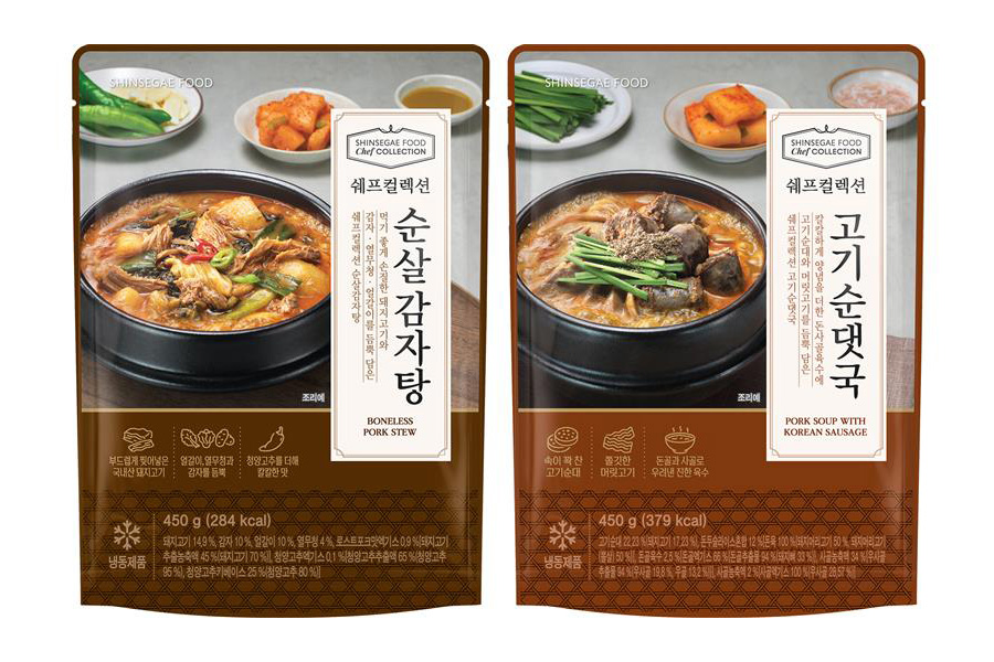 27일 신세계푸드는 ‘쉐프컬렉션’ 부대찌개, 어묵전골, 들깨칼제비 등에 이어 순살감자탕, 고기순댓국 등 신제품 2종을 출시하며 냉동 국물 간편식의 라인업을 확대한다고 밝혔다. 순살감자탕은 국산 돼지고기를 먹기 좋게 찢어 넣고 감자, 열무시래기, 우거지, 들깨가루, 청양고추 등을 넣어 고소하고 칼칼하게 끓여 낸 것이 특징이다. 고기순댓국은 칼칼하게 양념을 더한 돈사골육수에 국산 양배주와 돼지고기로 속을 채운 고기순대와 쫄깃한 머릿고기를 넣어 잡내 없이 깔끔하게 끓여낸 제품이다. 두 제품 모두 냉동 상태의 제품을 봉지 그대로 끓는 물에 넣고 15분만 데워 간편하게 즐길 수 있다.