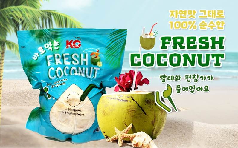 ‘바로먹는 코코넛’은 진공 압축 포장을 벗기면 동봉된 펀칭기로 코코넛 표면에 구멍을 내 빨대를 꽂아 간편하게 마실 수 있게 고안했다.