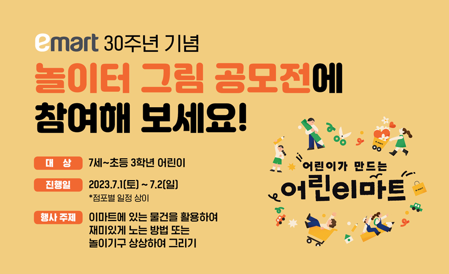 이마트가 오는 7월 1일과 2일 이틀 간 7~10세(2017년-2014년생) 어린이 고객을 대상으로 ‘놀이터 그림 공모전’을 진행한다.
