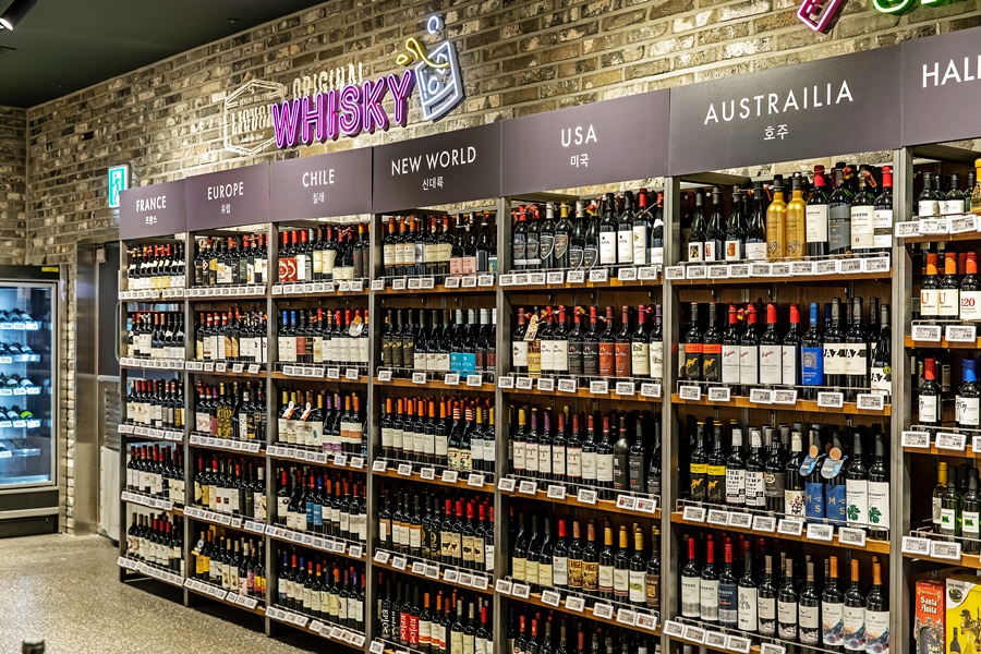 63평(208㎡) 규모의 ‘와인 앤 리큐르 샵’은 규모부터 시선을 사로잡는다. 언뜻 보기에 수백여 종의 와인이지만 걱정할 필요는 없다. 프랑스, 칠레, 미국 등 원산지에 따라 구획을 나누고, 가격표에는 당도로 맛의 특성을 표기하여 초보자들도 직관적인 이해가 가능하다.