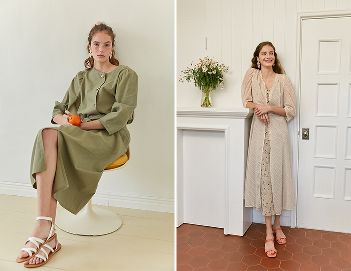 먼저 아이보리, 베이지, 브라운 등 코디가 쉬운 뉴트럴 색상을 기본으로 핑크, 민트, 옐로우 등의 파스텔 색상으로 포인트를 줬다. 원피스와 블라우스에 사용된 잔잔한 플로럴이나 도트 무늬에서는 20대의 발랄함을 엿볼 수 있다.