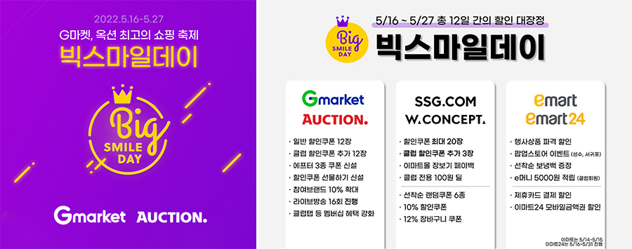 G마켓과 옥션이 진행하는 상반기 최대 쇼핑 축제 ‘빅스마일데이’가 16일부터 27일까지 총 12일 동안 진행된다.