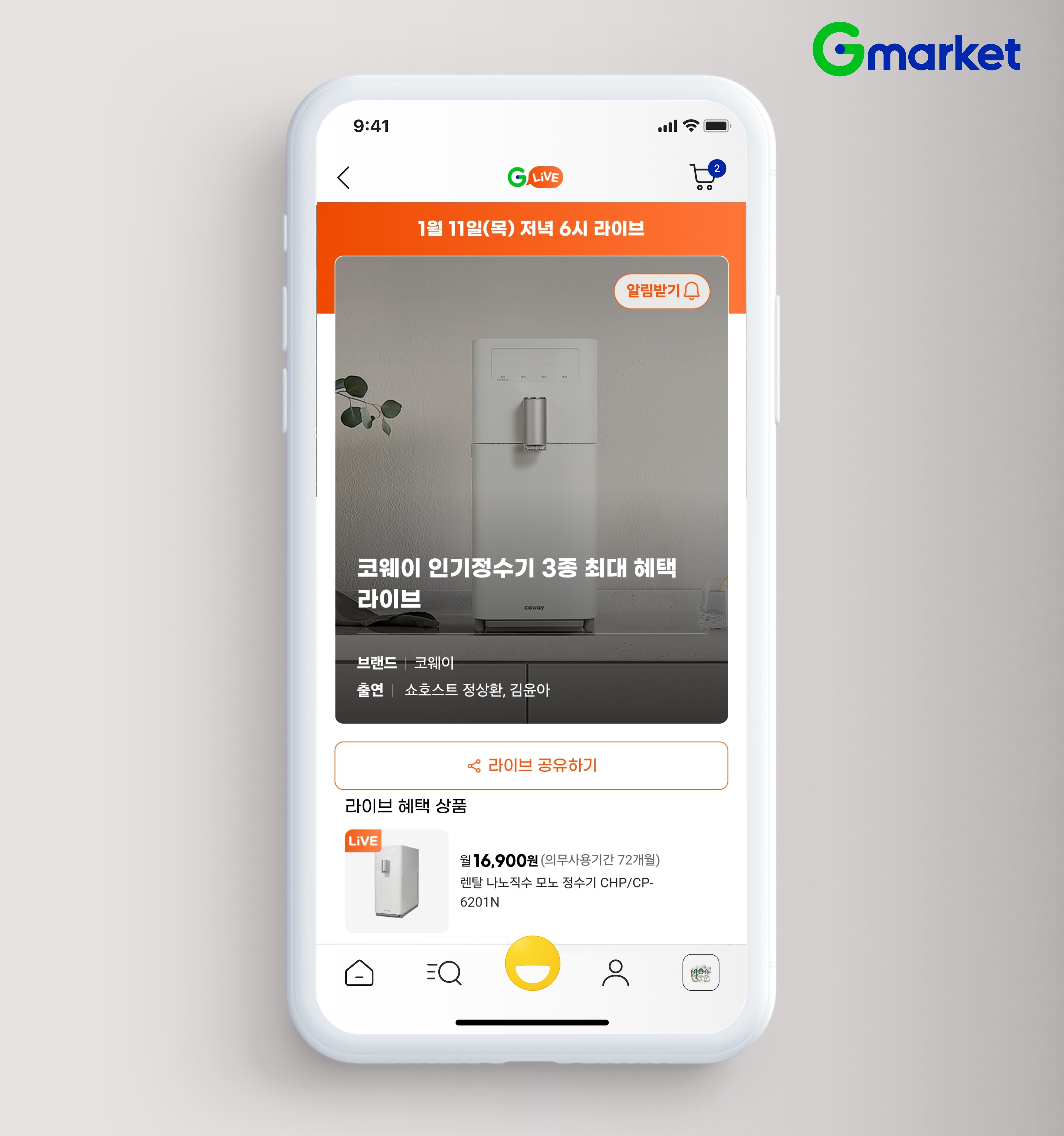 MEDIA 글자 크기 보통 크게 아주 크게 공유하기 페이스북 X 카카오톡 링크 복사 링크 복사됨 도구 보기 이미지 다운로드 G마켓, 11일 코웨이 정수기 3종∙비렉스 페블체어 라이브방송 2024.01.11 G마켓