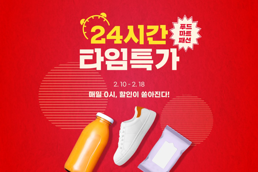 매일 상품군 별 인기 상품 10개를 선정해 최저가 수준으로 선보인다. 해당 ‘타임특가’는 한정수량 특가와 캐시적립 특가 상품으로 구성하며, 각 혜택은 상품 이미지에 부착된 아이콘으로 확인 가능하다. 타임특가 상품은 매일 밤 자정을 기준으로 달라진다.