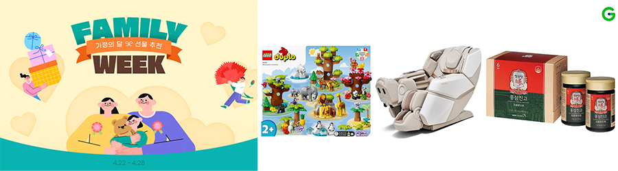G마켓과 옥션이 가정의 달을 맞아 오는 28일까지 일주일간 ‘패밀리위크’ 프로모션을 진행한다. 장난감, 건강식품 등 어린이날과 어버이날 인기 선물템을 최대 77% 할인가에 판매한다. 가족 단위 인기 여행상품도 추천한다.