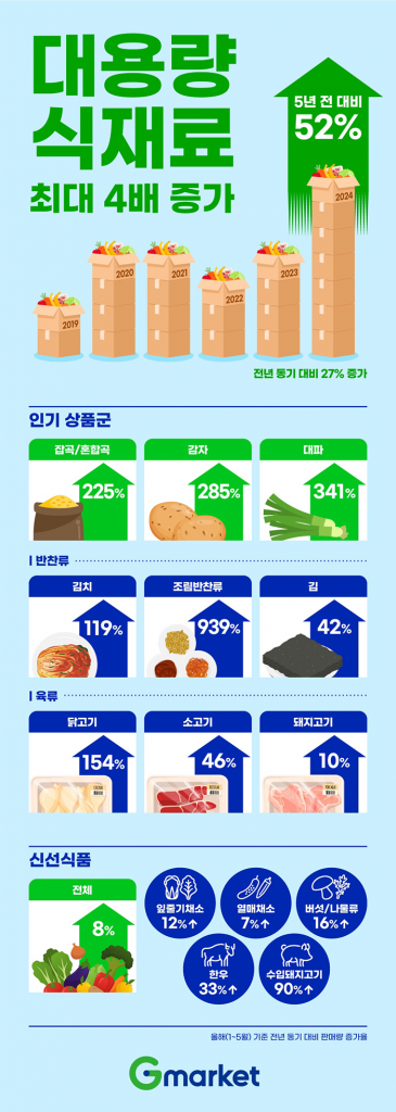 G마켓은 올해(1~5월) 판매량을 전년 동기와 비교한 결과, 대용량·벌크 신선식품이 27% 증가한 것으로 나타났다. 코로나19 확산으로 집밥 열풍이 불었던 3년 전(21년 동기간)과 비교해도 10% 증가했고, 코로나 이전인 5년 전(19년)과 비교하면 52% 늘었다.