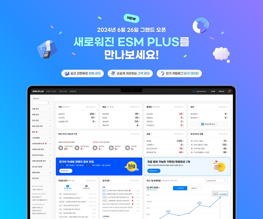 ESM PLUS는 G마켓, 옥션 입점 셀러가 상품 등록 및 마케팅, 고객 문의 처리를 위해 이용하는 내부 시스템이다. 이번 그랜드오픈에 앞서 지난 3월, 일부 서비스를 개편한 버전인 ‘ESM PLUS 베타 서비스’를 선공개한 바 있다. 당시 가독성 개선을 위한 사용자환경(UI) 개편, 상품 등록 간소화, 데이터 분석 툴 지원 등의 기능을 공개했다. 이번에 정식 오픈하는 새로운 ESM PLUS는 베타서비스에서 ▲간소화 ▲자동화 ▲효율화를 강조한 방향으로 기능이 강화됐다.
