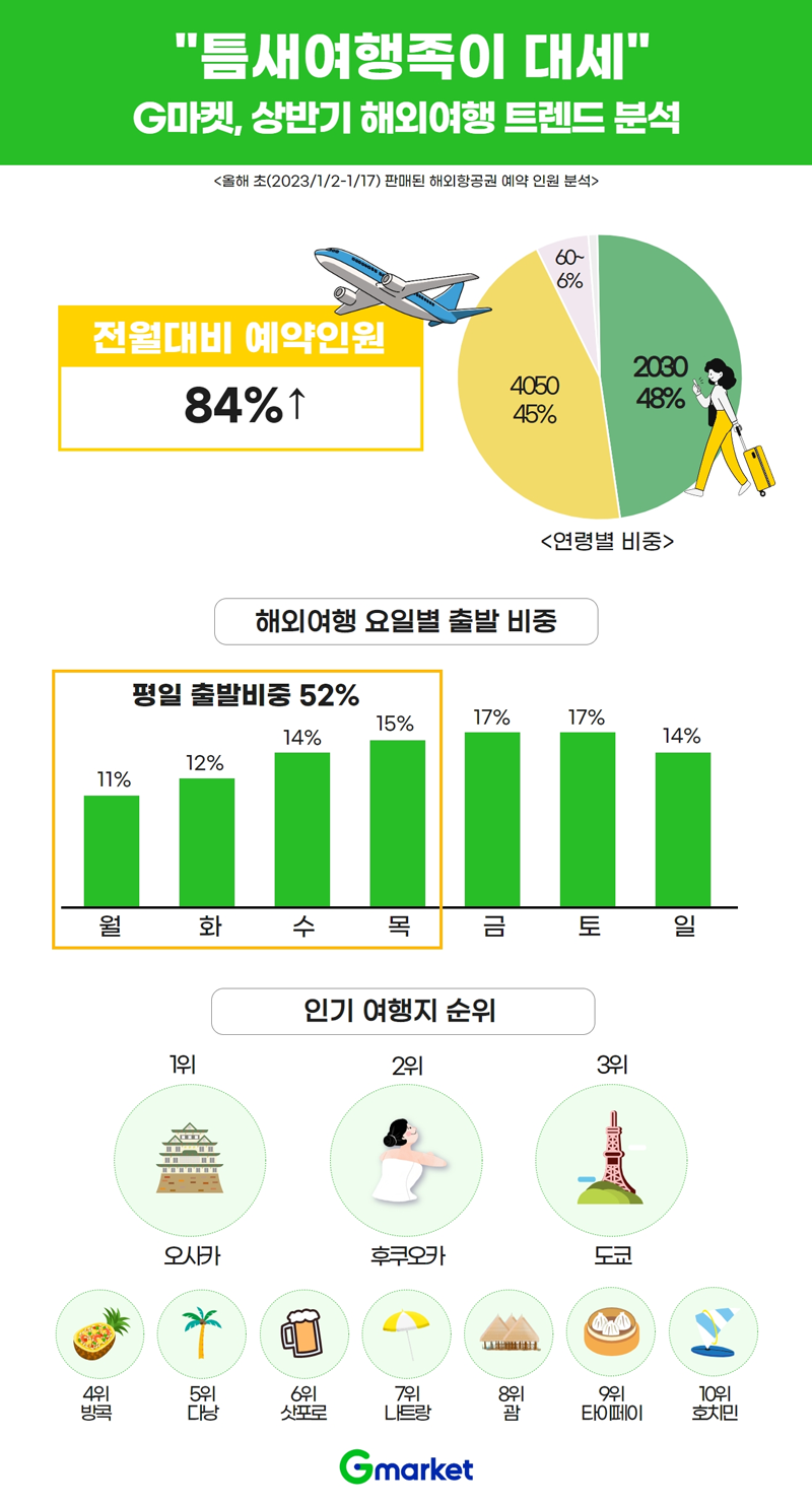 국내 대표 온라인 마켓플레이스 G마켓이 올해 초(2023/1/2-1/17) 판매된 해외항공권 예약 현황을 분석한 결과, 예약 인원은 전월 대비 84% 증가했고, 평일 출발 비중도 50%를 넘겼다. 월요일 출발 비중이 11%, 화요일 12%, 수요일 14%, 목요일 15% 수준이다. 주말(금~일) 출발 비중은 평균 16%로, 주말에 편중되지 않고 시간이 될 때 틈틈이 출발하는 것으로 해석할 수 있다.