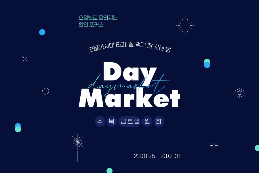 데이마켓은 고물가를 극복하고 소비심리를 회복하기 위해 요일별로 특정 카테고리를 선정해 특가 판매하는 G마켓과 옥션의 정기 프로모션이다. 매일 할인 카테고리가 달라지기 때문에 미리 특가 일정을 살펴보는 것을 추천한다.