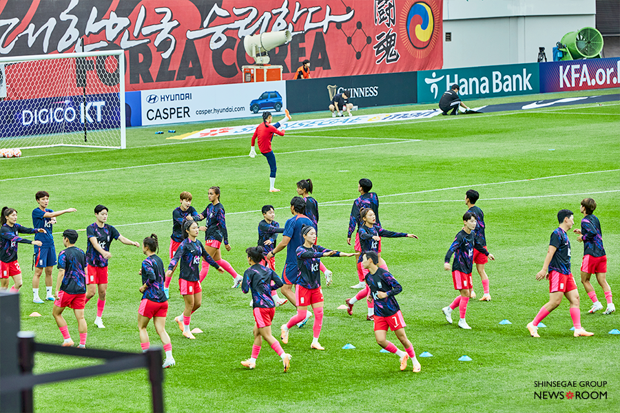 경기 약 1시간 전, 여자축구국가대표팀이 그라운드에 등장하자 관중들은 환호와 박수로 선수들을 환영했다. 관객들은 선수들의 이름을 연호했다. ‘대한민국 파이팅!’이라는 함성도 여기저기서 울려 퍼졌다. 여자축구국가대표팀 선수들도 팬들에게 인사하며 화답한 후, 몸을 풀기 시작했다.