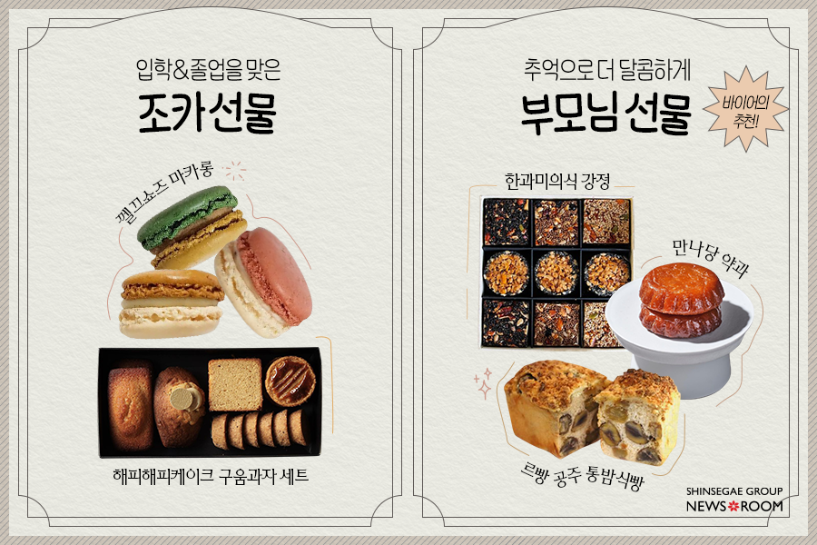 “입학, 졸업 시즌이죠. 조카를 위한 선물로 껠끄쇼즈의 마카롱을 추천합니다. 3구, 6구, 12구의 선물상자는 물론 낱개로도 구매할 수 있습니다. 과자와 케이크를 프리미엄 기프트 컨셉으로 판매하는 해피해피케이크의 과자세트도 입학, 졸업 선물로 적합한 고급진 선물입니다.