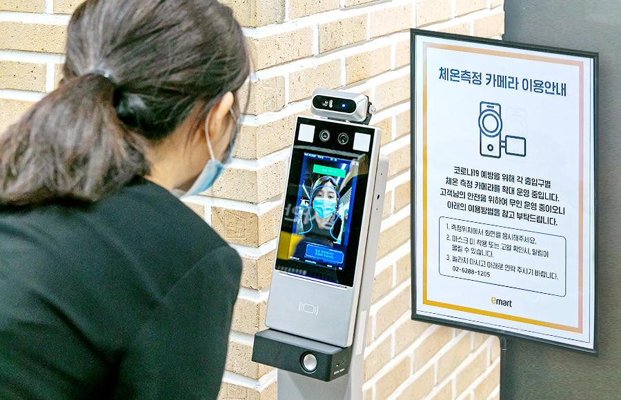 슬쩍 지나가기만 해도 체온을 측정해 알려준다. 작은 기계 하나로 고객의 불안감을 해소하고 안전한 쇼핑환경을 위한 조치를 완료했다.