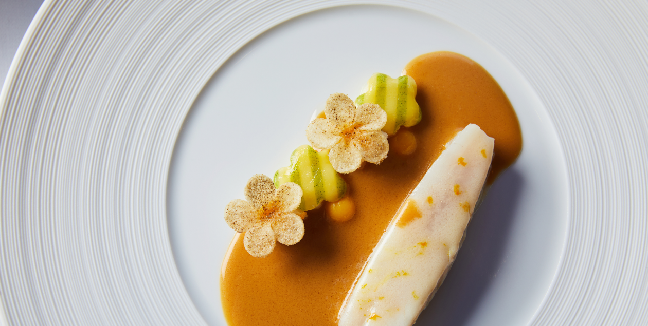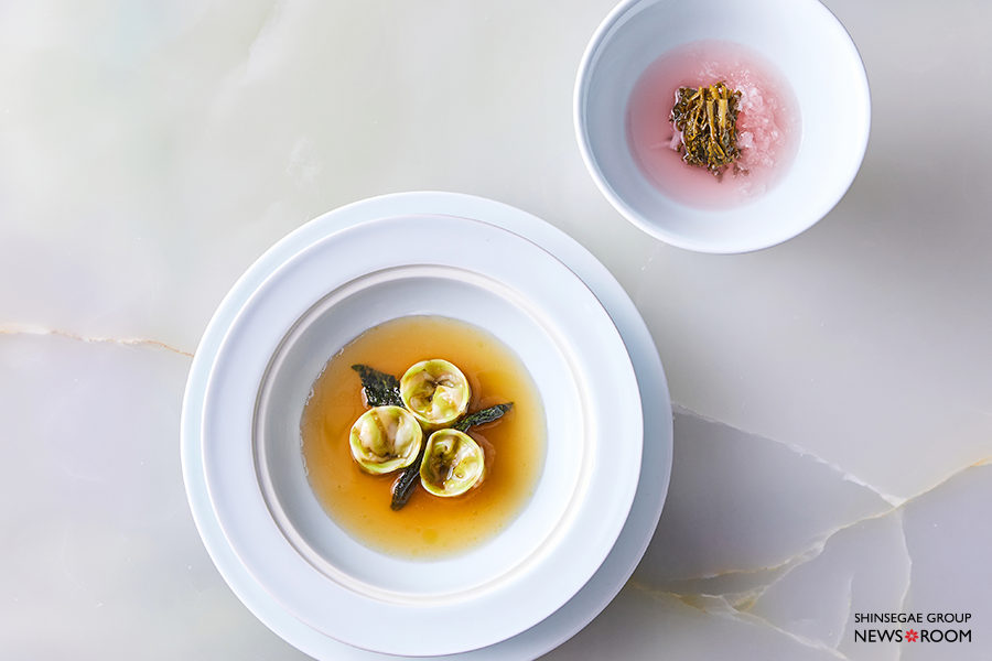 제주 찰광어는 일반 광어와 다르게 유럽에서 ‘터보(Turbot)’라 불리는 고급 어종이다. 이를 약 60도 가량의 미지근한 버터로 익혀, 고유의 탱글한 식감을 살렸다. 여기에 지리산 백강밀로 만든 파스타, 제주에서 난 천혜향과 한치, 포항초를 곁들였다. 생선 뼈와 새우, 일곱 가지 채소를 진하게 우려낸 미네스트로네 소스를 더해 깊은 풍미가 완성된다.