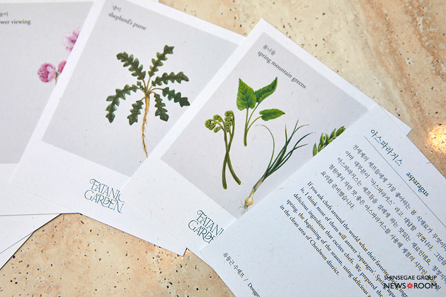 이타닉 가든의 철학은 작은 디테일에서도 드러난다. 이타닉 가든의 메뉴판은 일반적인 설명서 대신 제철 식재료, 채소 일러스트가 그려진 엽서의 형태다. 엽서 뒷면에는 이타닉 가든의 팀원들이 직접 작성한 식재료에 얽힌 추억, 스토리텔링이 담긴다. 이로써 식사는 고객들에게 기억에 남는 특별한 다이닝으로 완성된다.