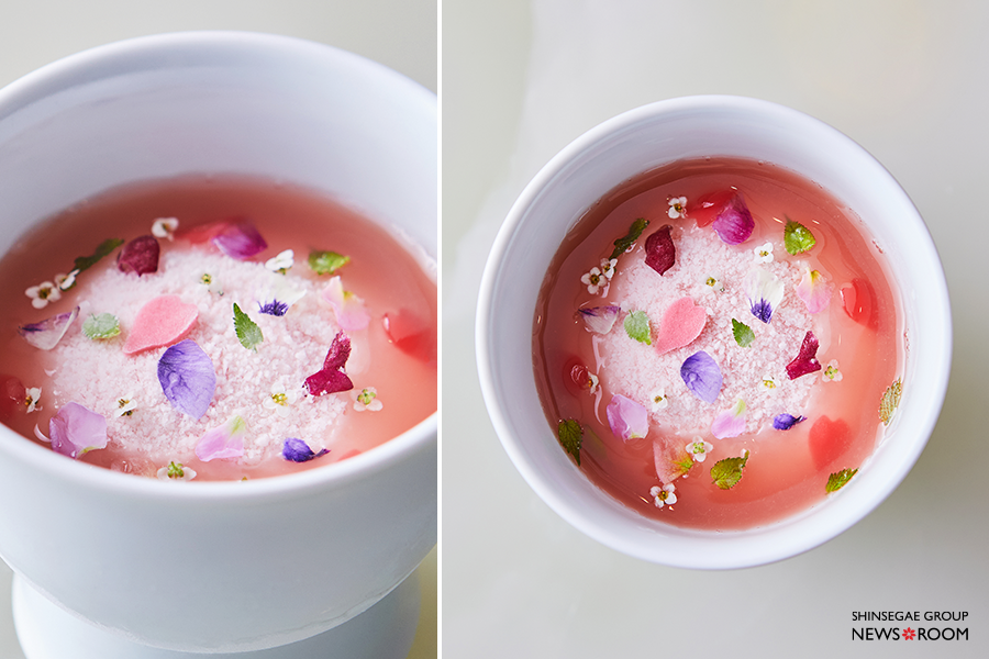 작은 그릇 속 화사하게 피어난 모습이 제 이름만큼이나 곱다. 방아잎과 딸기로 만든 소르베에 작은 딸기 떡을 꽃잎처럼 얹었다. 정성스레 엿기름을 우려낸 딸기 식혜가 더해져 은은한 단맛이 일품이다.