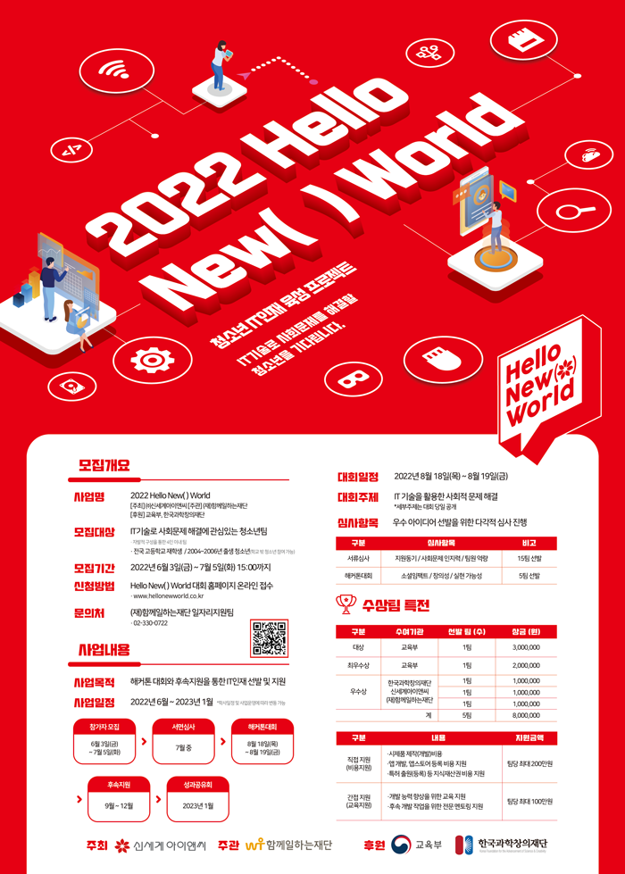 신세계아이앤씨와 함께일하는재단이 진행하고, 교육부와 한국과학창의재단이 후원하는 이번 해커톤대회는 오는 7월 5일까지 ‘헬로 뉴( ) 월드’ 홈페이지를 통해 참가자를 모집한다. 2004년~2006년생 청소년이라면 누구나 최대 4명까지 팀 단위로 신청할 수 있다.