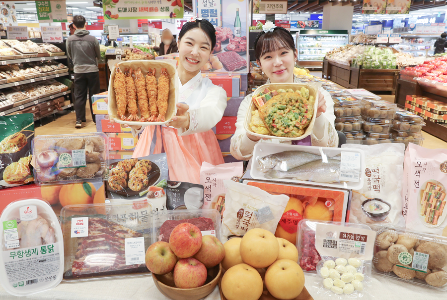 1월 23일 목요일 오전 이마트 용산점에서 모델들이 ‘설 먹거리 할인 행사’ 상품들을 소개하고 있다. 이마트는 24일(금)부터 30일(목)까지 먹거리 파격 행사를 준비, 긴 연휴 내내 든든한 밥상을 책임진다. 명절에 빠질 수 없는 ‘사과(6-12입, 박스)’, ‘나주 신고배’를 신세계포인트 적립 시 각 5천원, 2천원 할인된 가격에 구매할 수 있다. 이외에도 ‘블랙타이거 새우튀김(팩)’, ’실속 모듬전 세트(팩)’, ‘롯데 비타파워 (100ml *20개)’ 등 다양한 먹거리를 최대 50% 할인 판매한다.