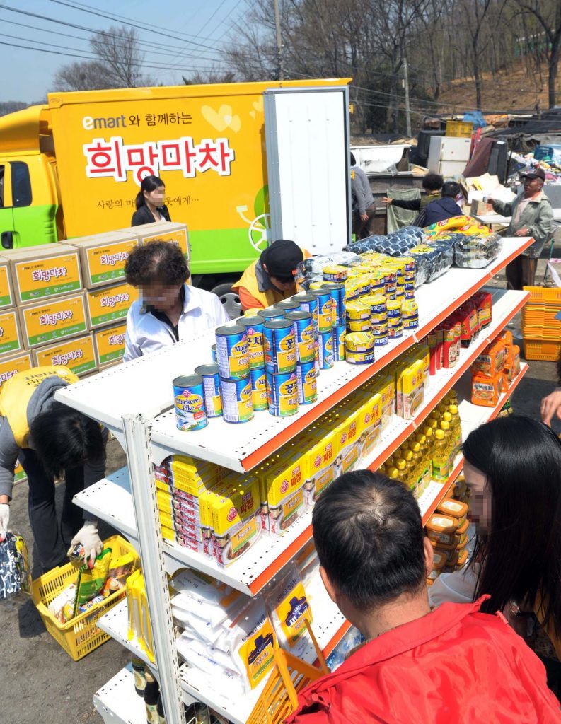 일반적인 생필품 지원의 경우, 정해진 물품을 전달하는 방식인데 반해, 이마트 ‘희망배달마차’는 이동식 장터를 열어 수혜자들이 직접 원하는 품목을 선택하는 방식으로 진행돼 참여도는 물론, 만족도가 매우 높은 것이 특징이다. 이마트는 실질 만족도를 높이기 위해 매 행사마다 사전 수요 조사를 통해 40 ~ 50여 종의 상품을 선정하고 있다.