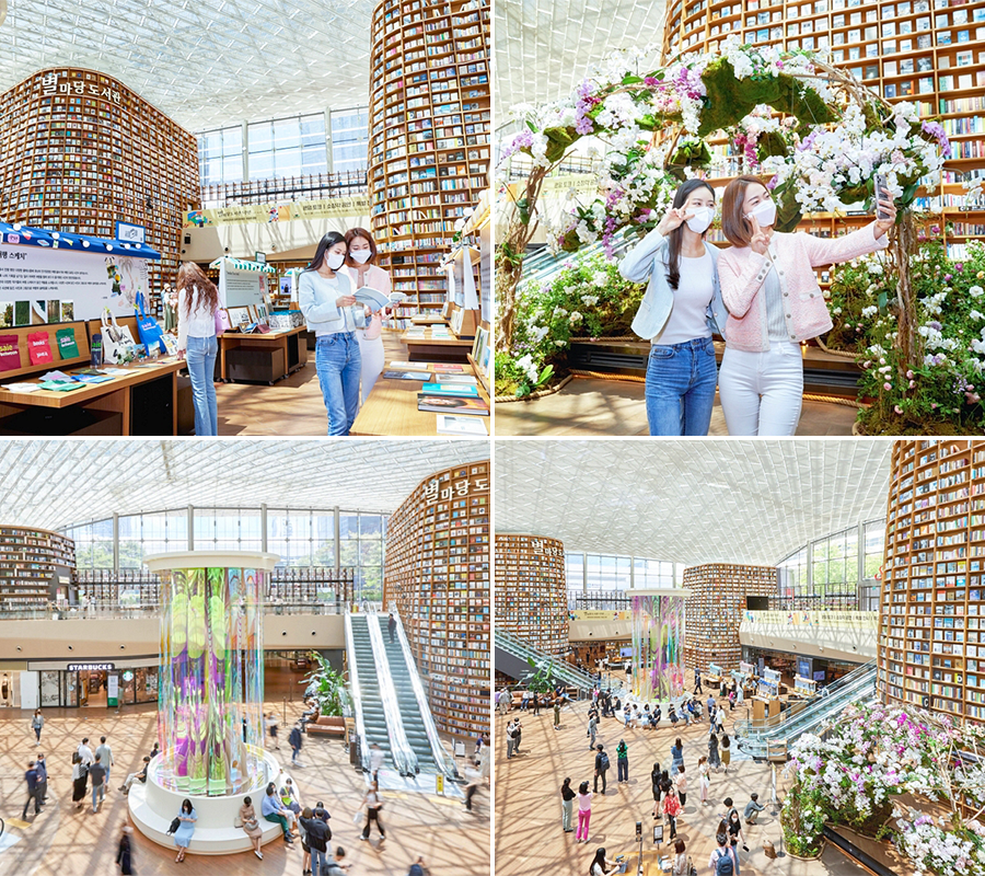 오랫동안 여행을 떠나지 못한 아쉬움을 달래고 다시금 여행의 설렘을 느낄 수 있는 테마도서전 ‘별마당 도서관에서 떠나는 여행(5/27~6/30)’도 진행한다. 문화유산, 맛집, 여행지, 여행 사진 등 우리가 좋아했던 여행의 모든 것이 담긴 서적들을 선보인다. 보테니컬 아트 컴퍼니 ‘팀보타’는 별마당 도서관에 형형색색의 장미를 활용한 ‘꽃 구름(FLOWER CLOUD)’ 아트존(5/27~6/19)을 전시한다.